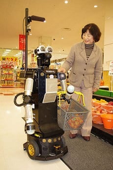 This new shopping assistant, named Robovie-II, was mainly created to help elderly customers have an easy grocery shopping experience. The way Robovie-II works is simple, the customer first writes down their grocery list on a special mobile device at home. Then when they arrive at the store, sensors throughout the supermarket will recognize the mobile device and, one of the many, Robovie-II will approach the customer to greet them. The robot then follows the customer around the grocery store, carrying their items, and reminding them what else is on their list.
